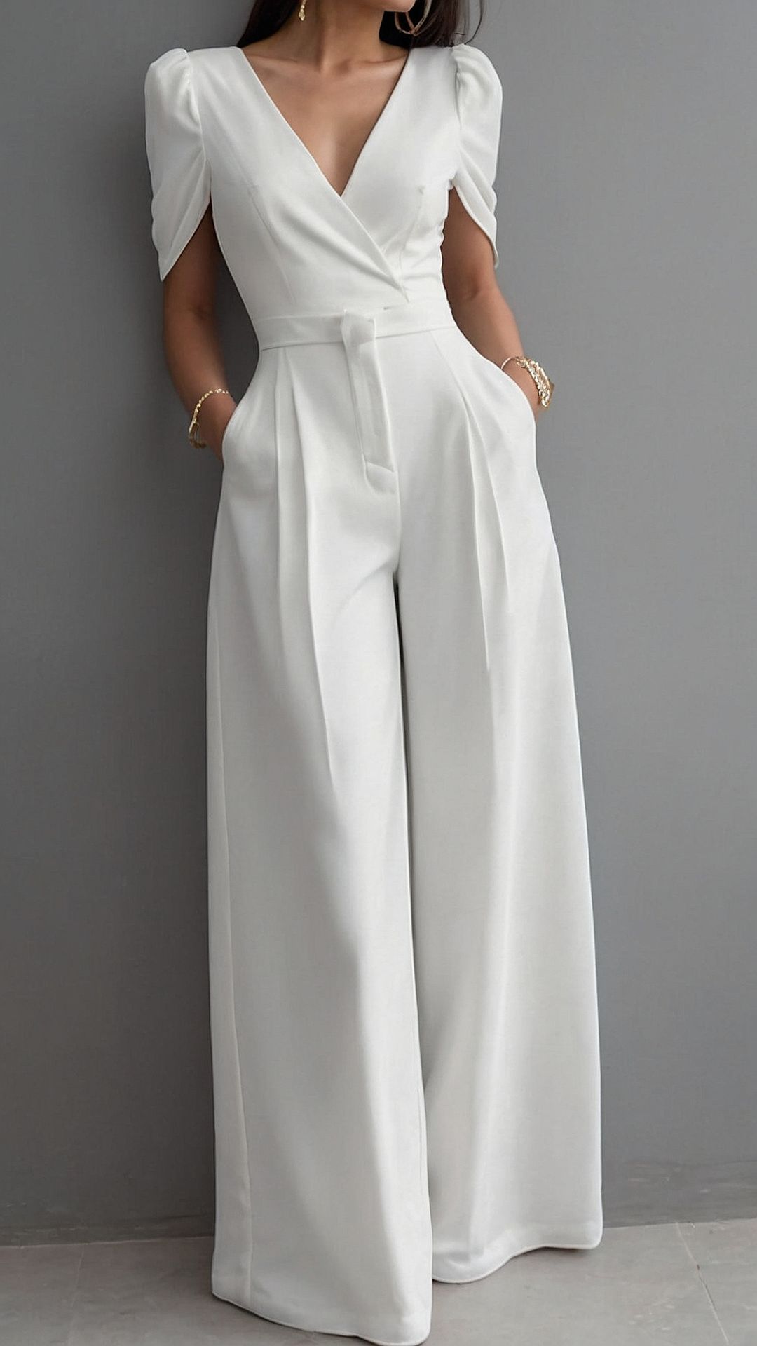 A stunning statement piece, this pure white jumpsuit features a flattering V-neck, elegant cap sleeves, and a defined high waist that flows into dramatic wide-leg palazzo trousers. Crafted from luxurious tailored fabric, it offers a clean, commanding, and unforgettable silhouette perfect for any upscale event.