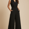 Keep accessories sleek and impactful. Pair this jumpsuit with metallic gold or silver stilettos and a complementary clutch. A wide, gold cuff bracelet (as pictured) or statement chandelier earrings will complete the look. For a slightly more formal feel, layer a tailored white blazer over the shoulders. The wide-leg cut requires height, so we recommend high heels or platform sandals to ensure the perfect drape.