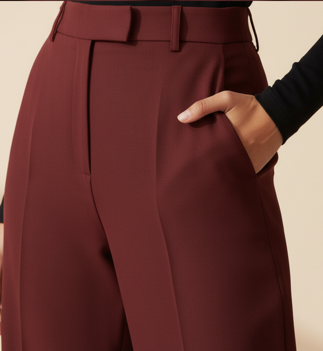 High-Waisted Wide-Leg Trousers – Bordeaux. Features a clean, uncluttered front and a flowing wide-leg silhouette. Crafted from premium Bordeaux fabric for a rich, elegant drape. A versatile piece for sophisticated styling.