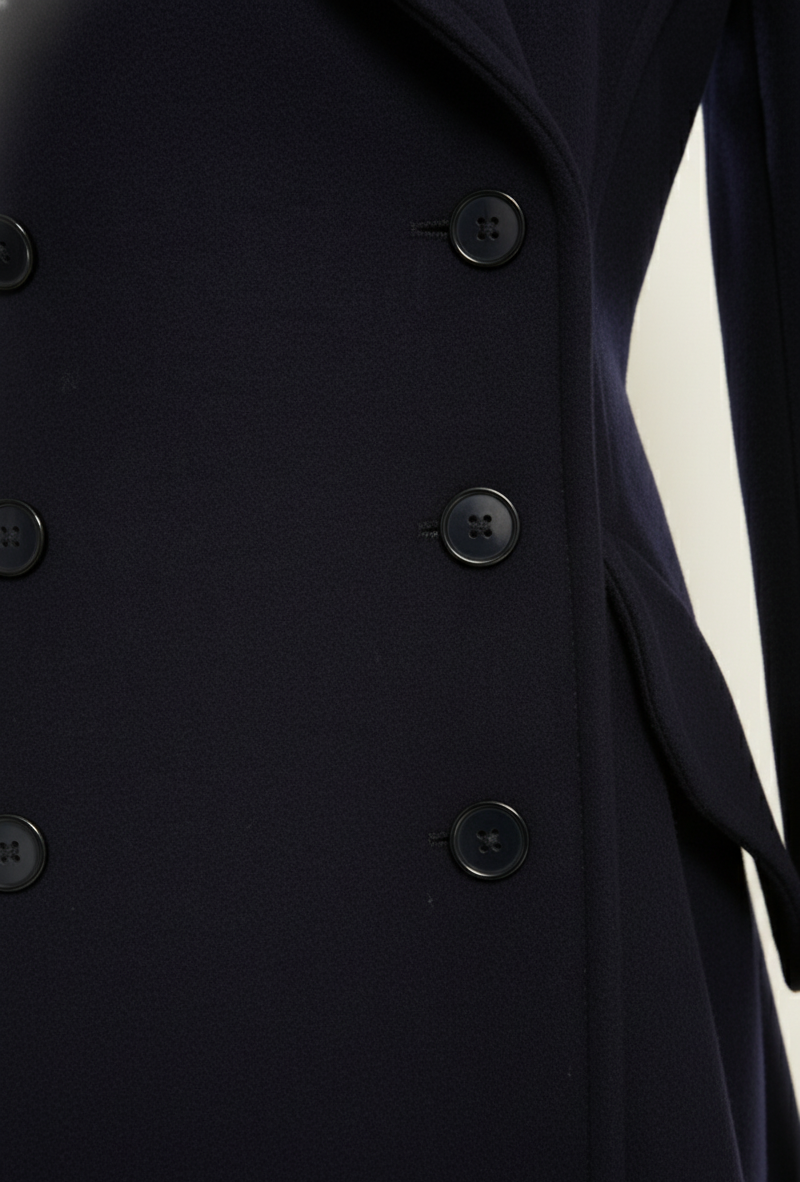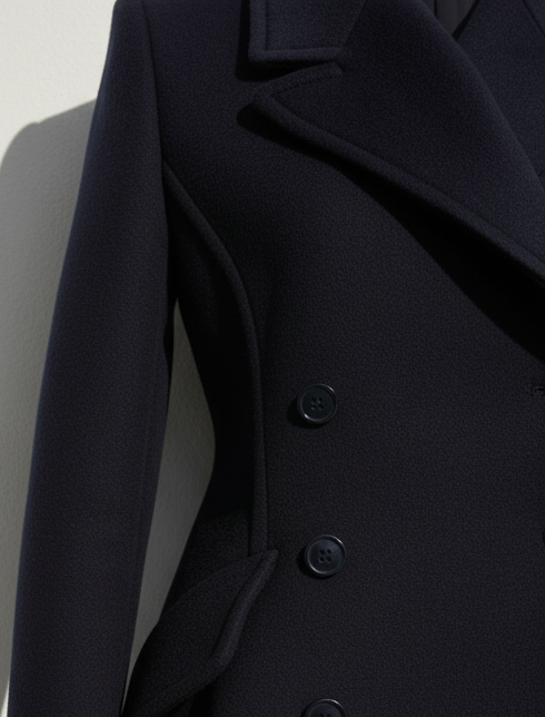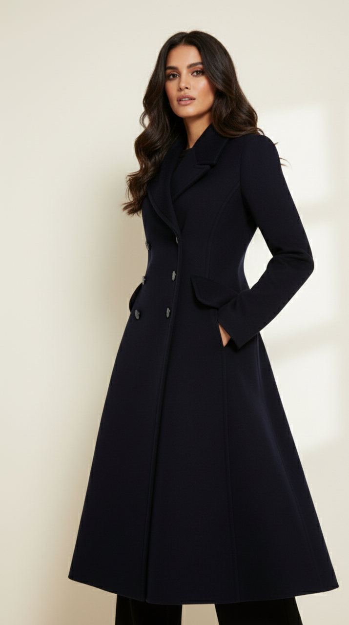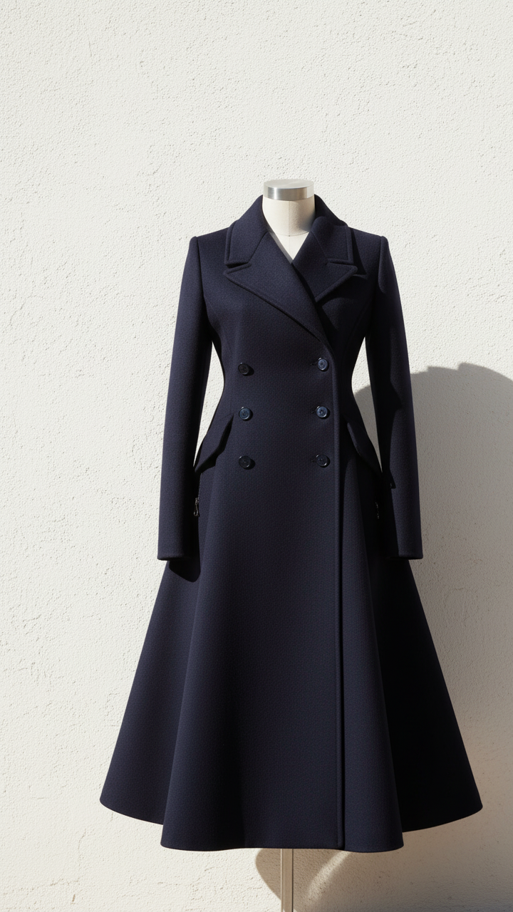 Long Double-Breasted Wool Coat – Midnight Blue. Features a tailored waist and a dramatic, voluminous “Couture Flare” hemline. Structured shoulders, fluid movement, and premium fabric for elegant warmth. A show-stopping piece of discrete luxury.