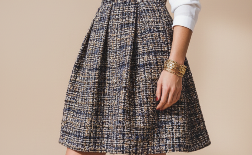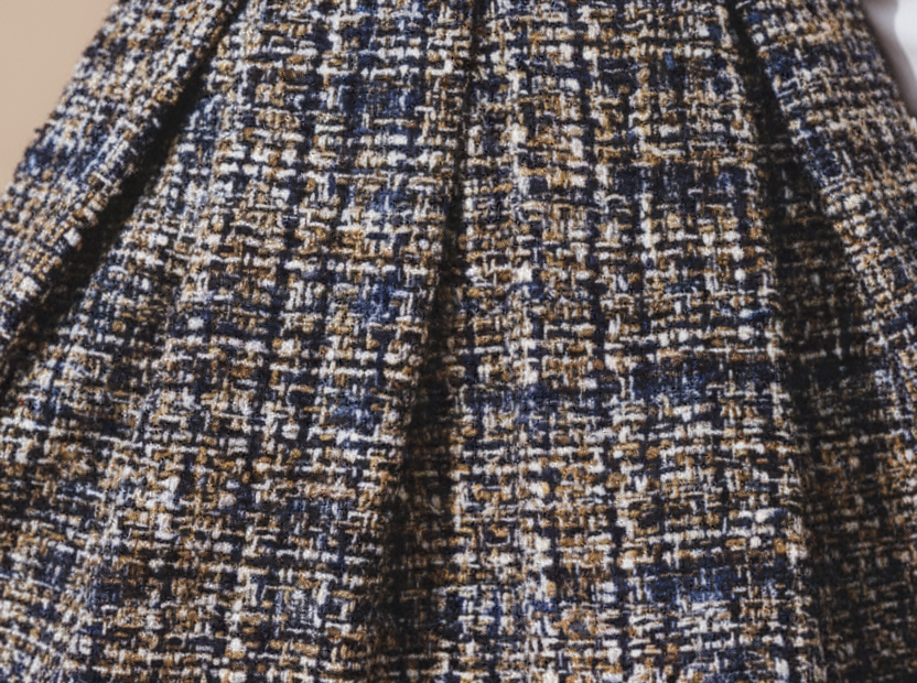 The “Heritage Plaid” Dress is a sophisticated reinterpretation of the classic pinafore, perfect for the modern woman’s elevated wardrobe. Crafted from a richly textured multi-hued tweed, featuring deep browns, navy, and accents of caramel gold, this dress boasts a fitted bodice and a flattering pleated A-line skirt. Designed to be layered, the sleeveless structure and rounded neckline offer endless styling possibilities. Worn over a crisp white collared shirt (as pictured), it provides a charming yet polished academic-chic aesthetic. This piece is an essential staple for fall and winter, blending tradition with contemporary charm.