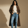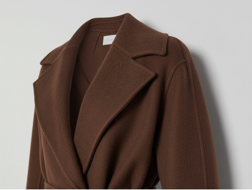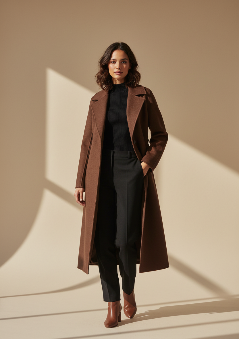 Long Draped Wool & Cashmere Coat – Chocolate Brown. Luxuriously soft, with a fluid silhouette and wide lapels. Features a self-tie belt for versatile styling. The ultimate cold-weather essential for sophisticated comfort and enduring elegance.
