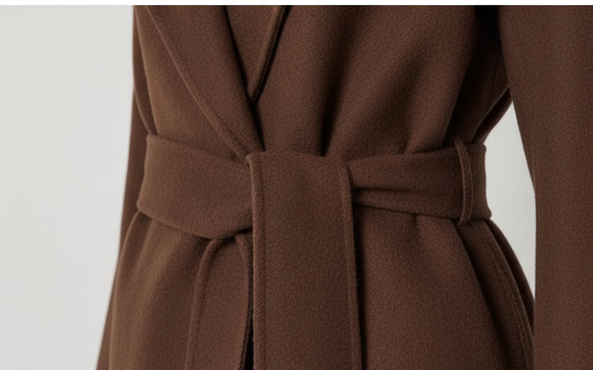 | Details | Wide Notched Lapel, Removable Self-Tie Fabric Belt, Discreet Side Pockets, No visible closure. |
