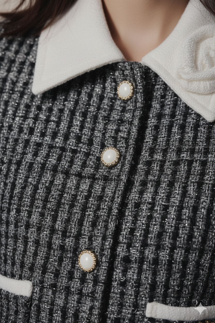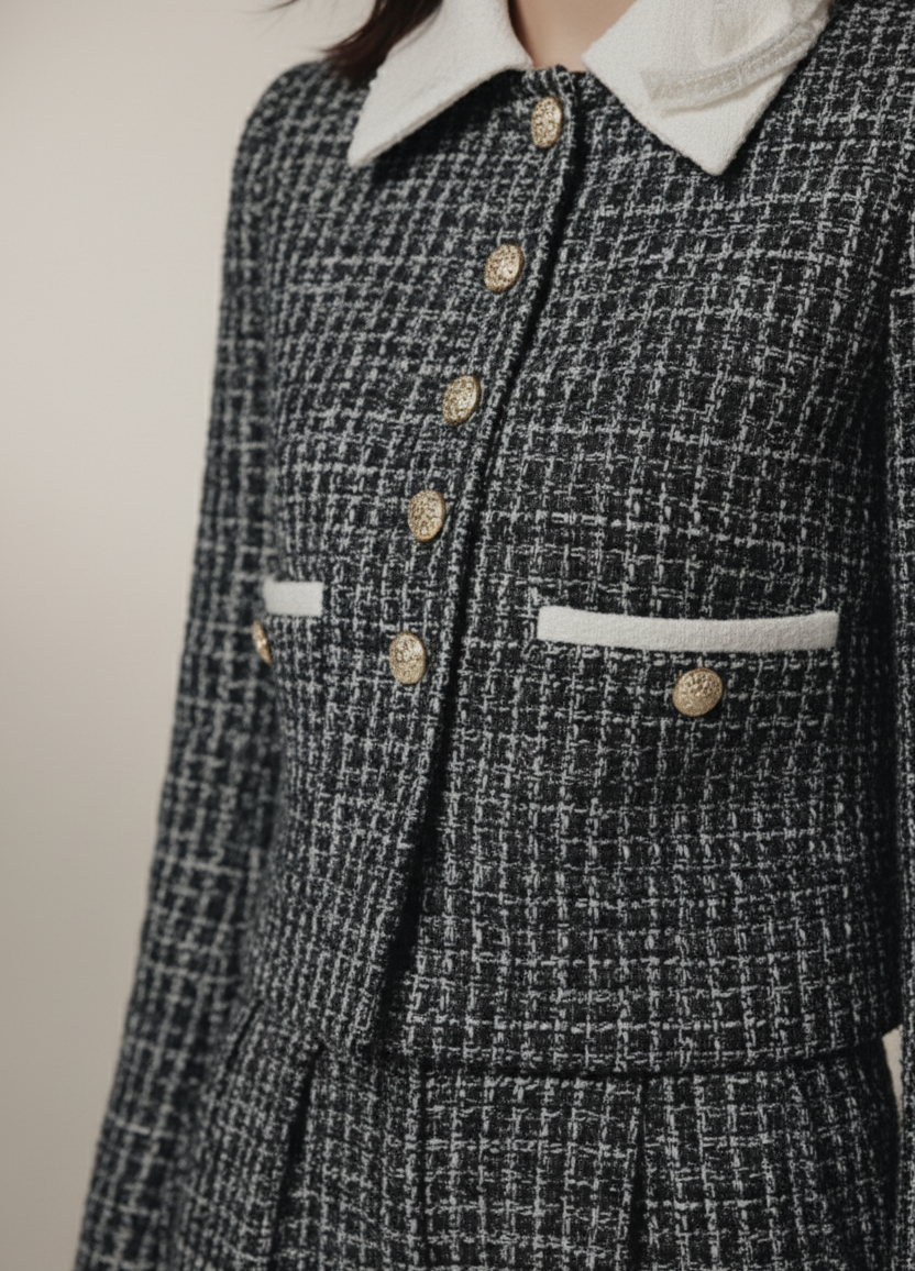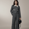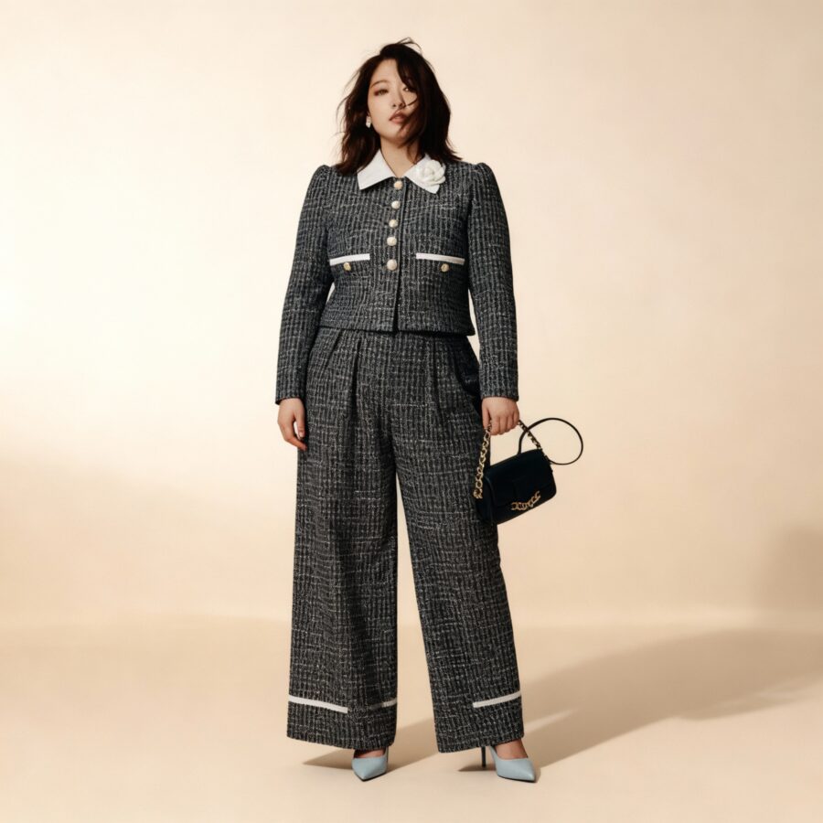 The “Parisian Horizon” set perfectly marries classic sophistication with confident, contemporary tailoring designed to flatter every curve. This two-piece ensemble is crafted from a luxurious dark charcoal tweed, enriched with subtle contrasting flecks. The jacket features a cropped, boxy silhouette that works beautifully to define the natural waistline and balance the overall figure. It includes a crisp white contrast collar (or is designed to be worn with a separate blouse as shown), accented by delicate white piping and elegant gold-tone buttons. Paired with high-waisted, dramatically wide-leg trousers, the set creates a powerful and elongated profile. The wide-leg cut ensures both comfort and a sweeping, elegant drape. This ensemble is a timeless statement of refined luxury, offering both structure and ease for the discerning woman.