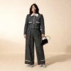 A luxurious two-piece ensemble in a rich charcoal tweed, featuring a chic cropped boxy jacket with white trim and dramatically wide-leg trousers. This set delivers a modern, high-fashion silhouette that blends classic French elegance with contemporary tailoring. A commanding choice for the sophisticated wardrobe.