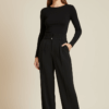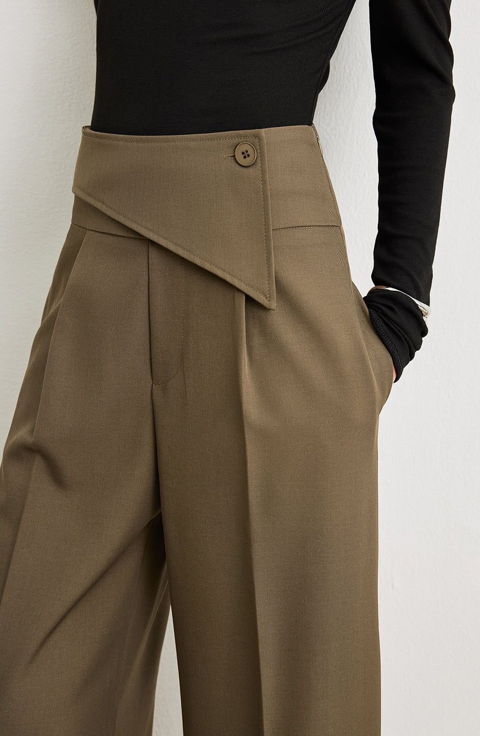 These trousers feature a flattering high-waisted, wide-leg cut designed to elongate the silhouette. The defining detail is the asymmetrical, folded panel at the waist, secured by a subtle button closure, which introduces an architectural element and modern complexity. Classic deep pleats run down the front, maintaining the sharp vertical line, while the wide cut ensures a relaxed, elegant flow with every step. Discreet side pockets and a clean back finish maintain the minimalist aesthetic.