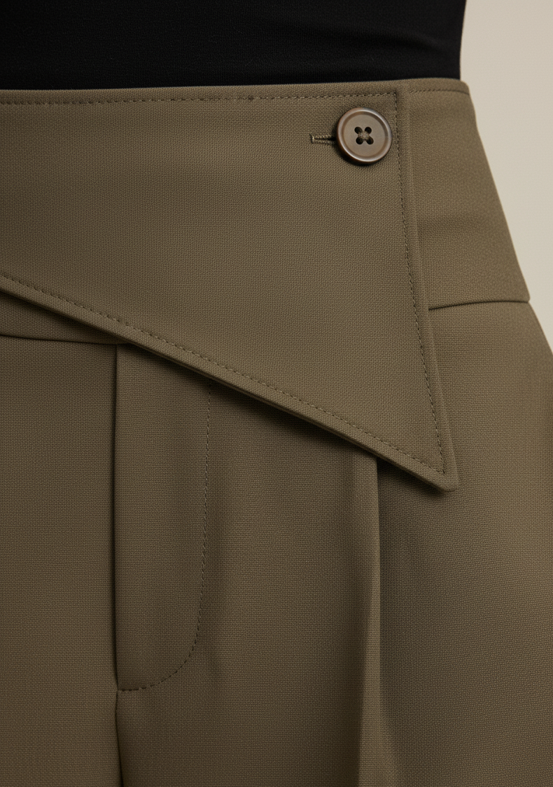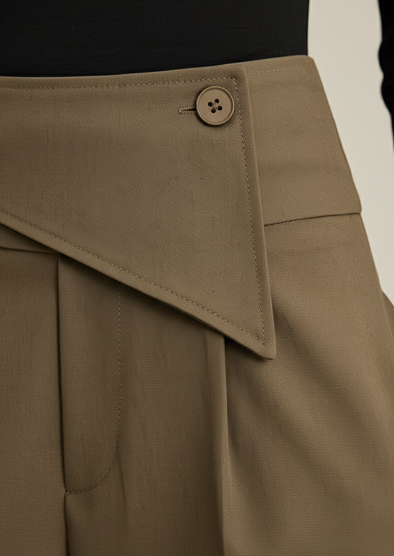 Wide-Leg Trousers – Deep Olive/Khaki. Features a sharp high-waist cut with a unique asymmetrical, folded panel detail. Deep front pleats and a fluid wide-leg silhouette. A versatile piece of architectural tailoring.