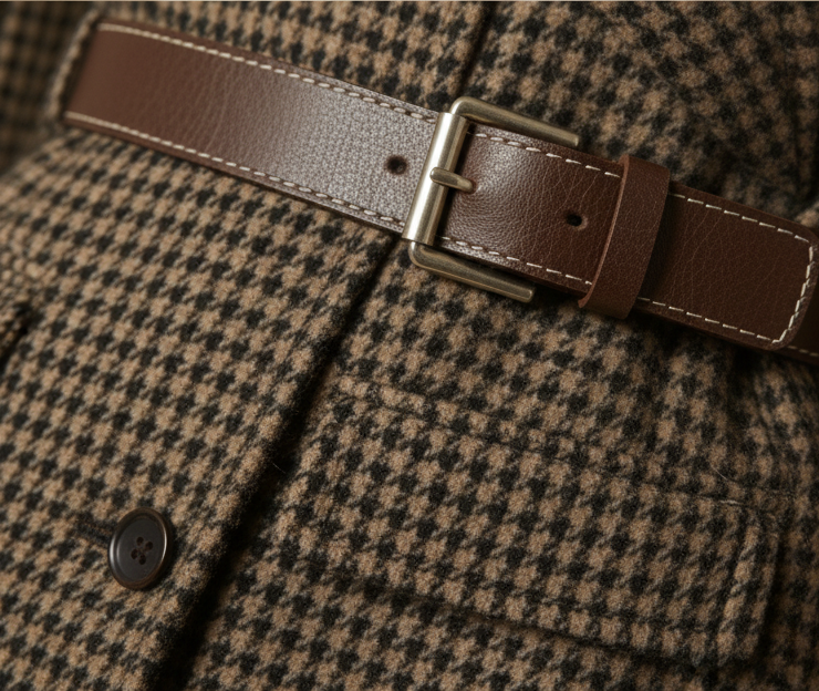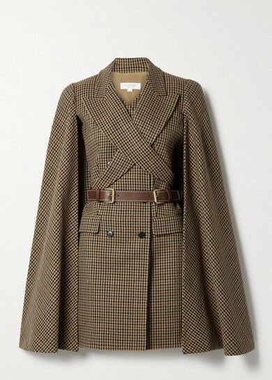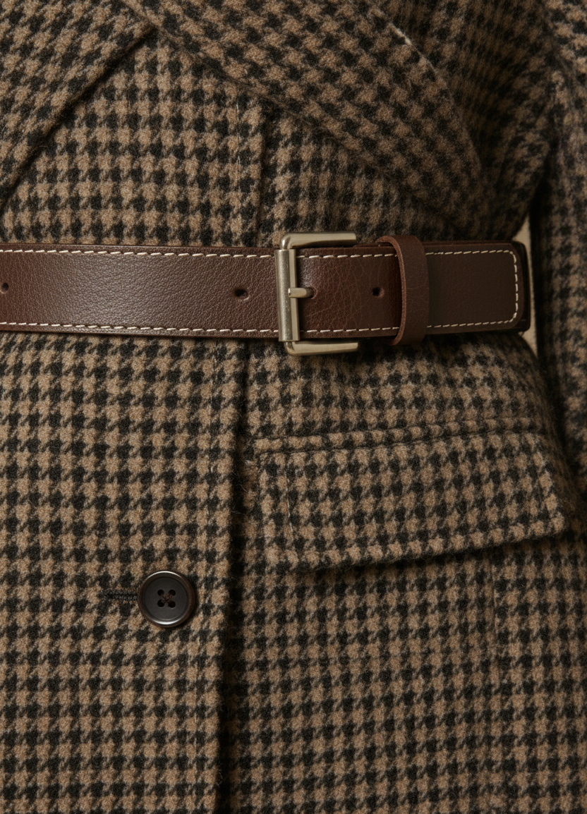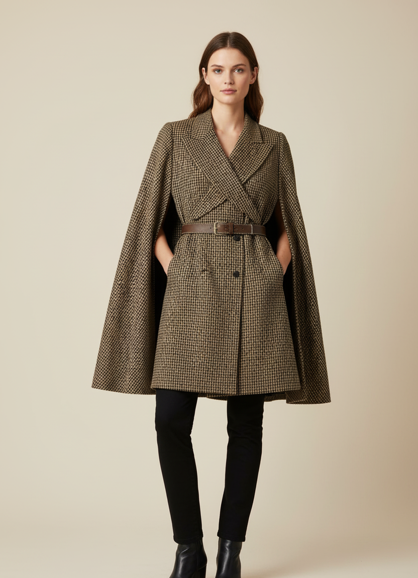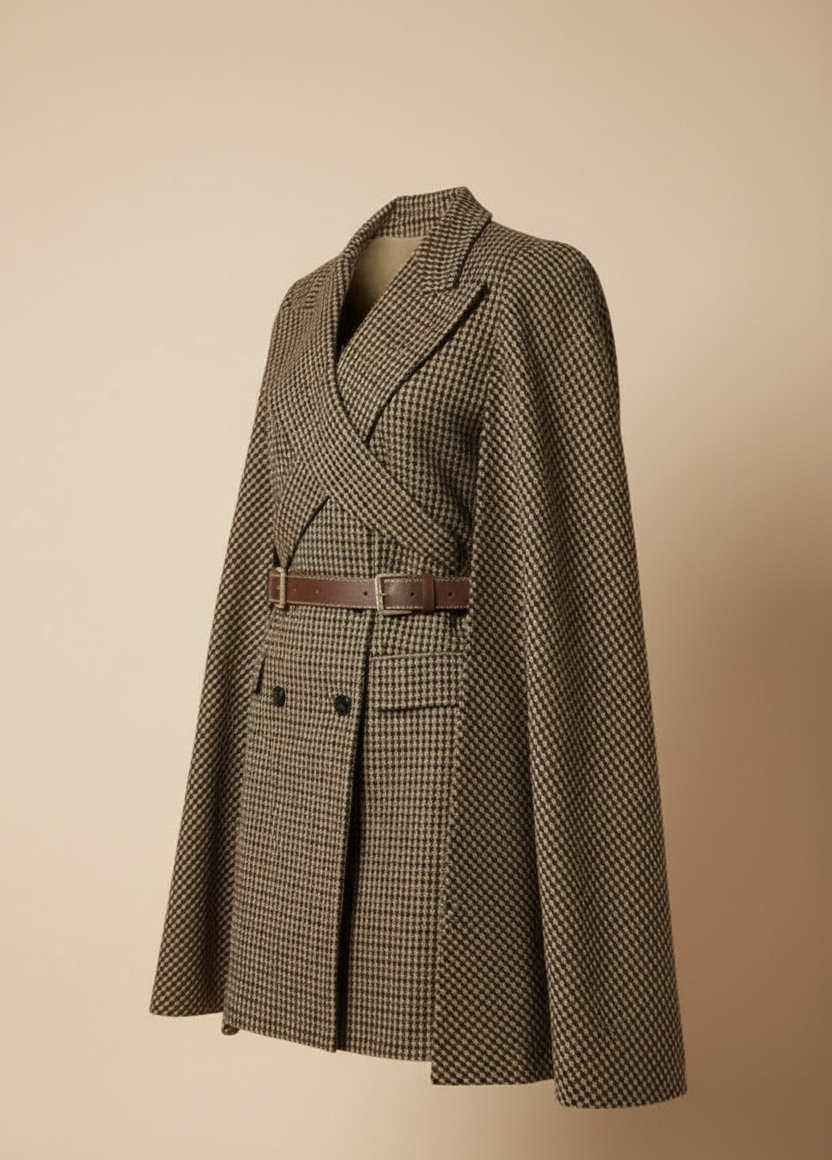 Command attention with the ‘Duchesse’ Cape Blazer, a masterclass in modern tailoring that redefines outerwear. This exquisite piece combines the sharp lines of a classic blazer with the dramatic sweep of a cape, rendered in a sophisticated Micro-Houndstooth pattern in rich Camel and Black tones.