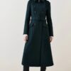 The design is distinguished by its unique crossed front detailing that creates an architectural silhouette, leading into a double-breasted closure. Fully integrated, flowing cape sleeves lend an air of elegant movement and grandeur. A contrasting rich brown leather belt, cinched at the waist, accentuates the figure while adding a touch of artisanal luxury. Functional flap pockets are seamlessly incorporated into the structured design.