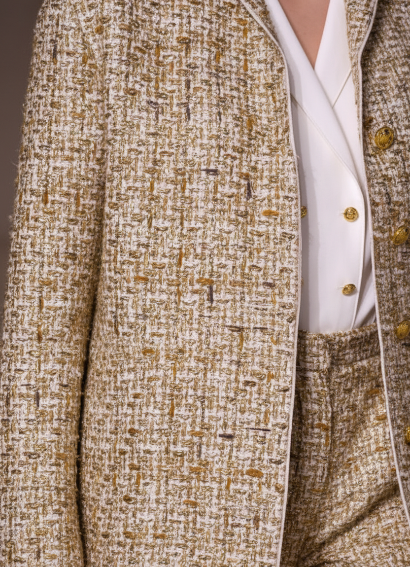 Discover effortless sophistication with the “Golden Radiance” ensemble, a chic take on the classic suit. This elegant two-piece is tailored from a richly textured tweed fabric, showcasing delicate woven metallic threads in shades of beige, ivory, and shimmering gold. The key piece is the longline cardigan-jacket, designed without a stiff structure for a softer, more relaxed yet polished feel. It pairs perfectly with the wide-leg trousers, which offer a modern, flowing silhouette. Worn over a silk shell top or a light blouse, this set embodies comfort and luxury, making it an ideal choice for the discerning woman seeking flexible elegance.