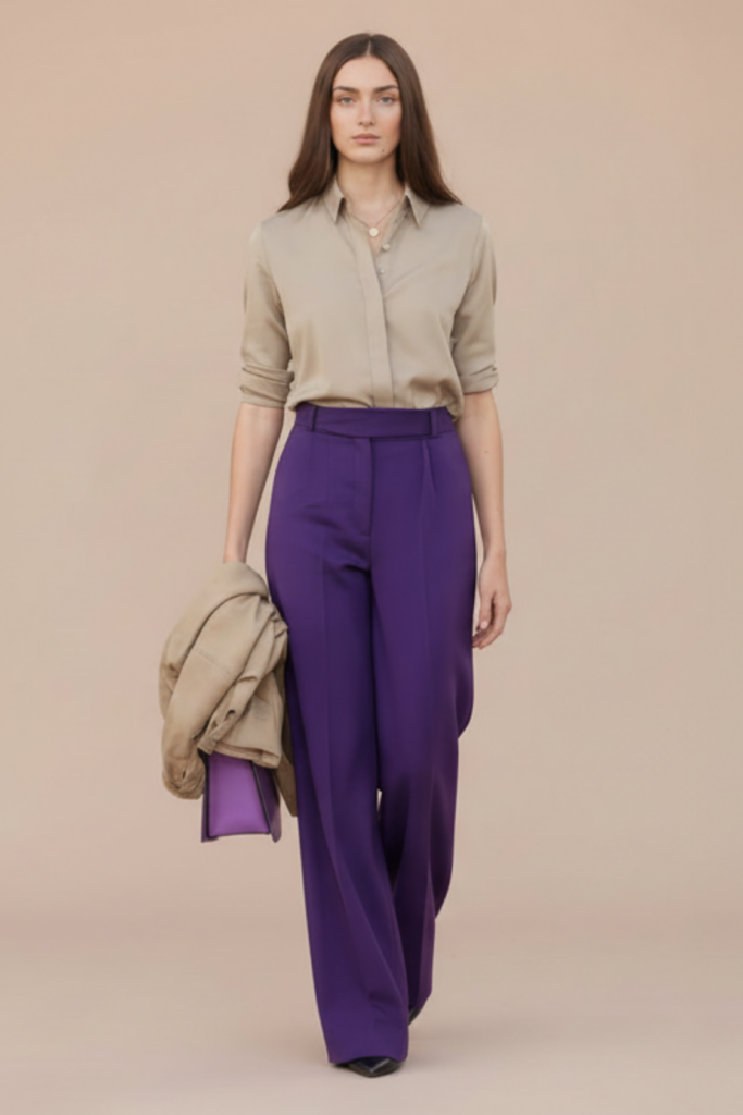 Pantalon large palazzo gris anthracite taille haute, tissu lisse mat structuré, jambe très ample. Sneakers blanches, sac bandoulière Dior monogram. Look casual luxe pour le quotidien.