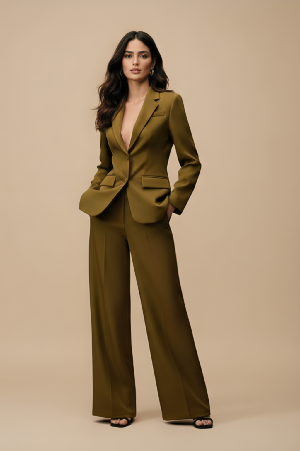 Costume monochrome kaki/olive. Blazer simple boutonnage 1 bouton, revers larges en pointe, poches à rabat larges, coupe cintrée très structurée. Pantalon palazzo très large taille haute assorti, tissu lisse mat à léger éclat. Sandales noires plates, boucles d’oreilles rondes argentées.