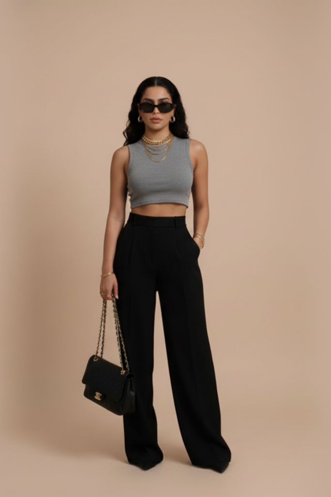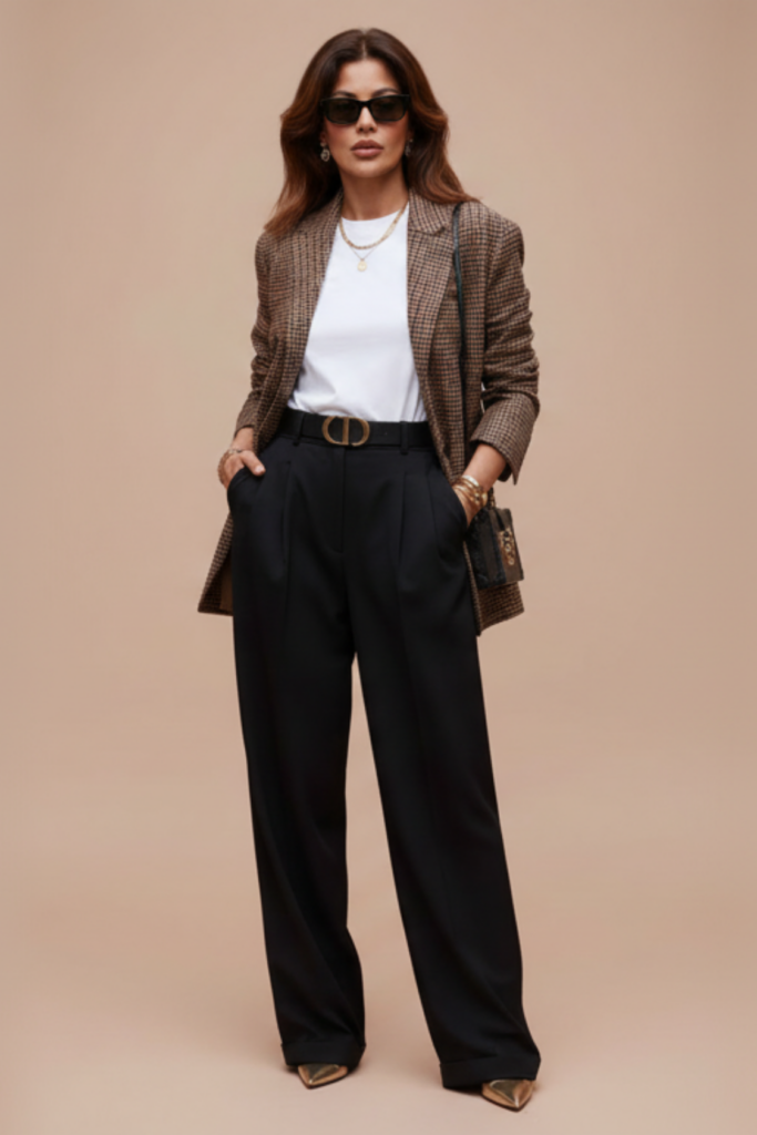 Robe mini fourreau en tweed bouclé noir et blanc à carreaux, col carré, manches longues légèrement bouffantes aux épaules, coupe très ajustée moulante. Finitions effilochées bord franc style Chanel sur l’ourlet et les poignets. Tissu épais structuré avec fils métalliques argentés visibles. Escarpins noirs.